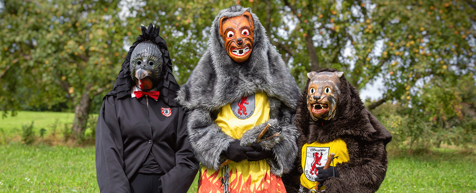Die Masken stellen zwei verfeindete Brüder in Form von Hund und Katze dar, die laut der Sage nach einem Brudermord mit einem Fluch belegt wurden und in wilden Sturm- und Gewitternächten auf den Burgruinen des Wartenberg herumgeistern müssen.
